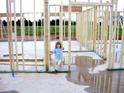 The framers will start with the outside walls first and work in ... but we did not get a ton done the first two days because of the rain .... the rug rat loved it thou... she got a chance to work on her balance beam work...